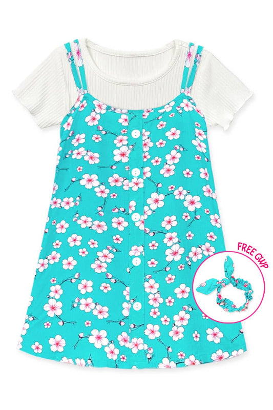 Girl's 2 pc Floral Dress & Ribbed Tee Set & scrunchie