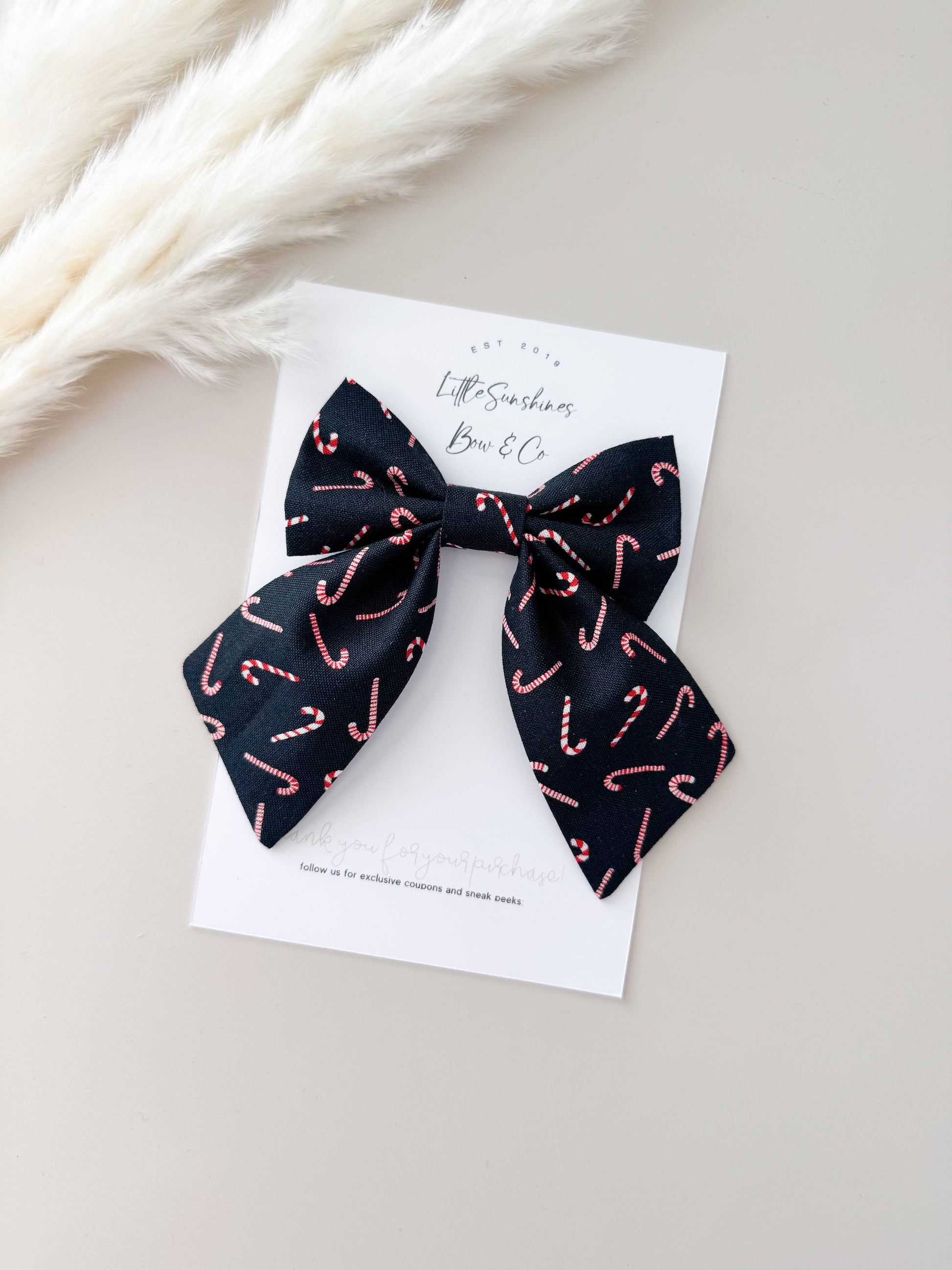 Christmas Sailor Bows are available in small size Sailor bows and is perfect to pull hair out of face, added to a half pony. Bow is attached to a non-slip alligator clip. Sailor Hair Bows are handmade and fabric is hand cut so patterns vary for each one. Size: Small: 4” X 4” Navy, with red and white candy canes